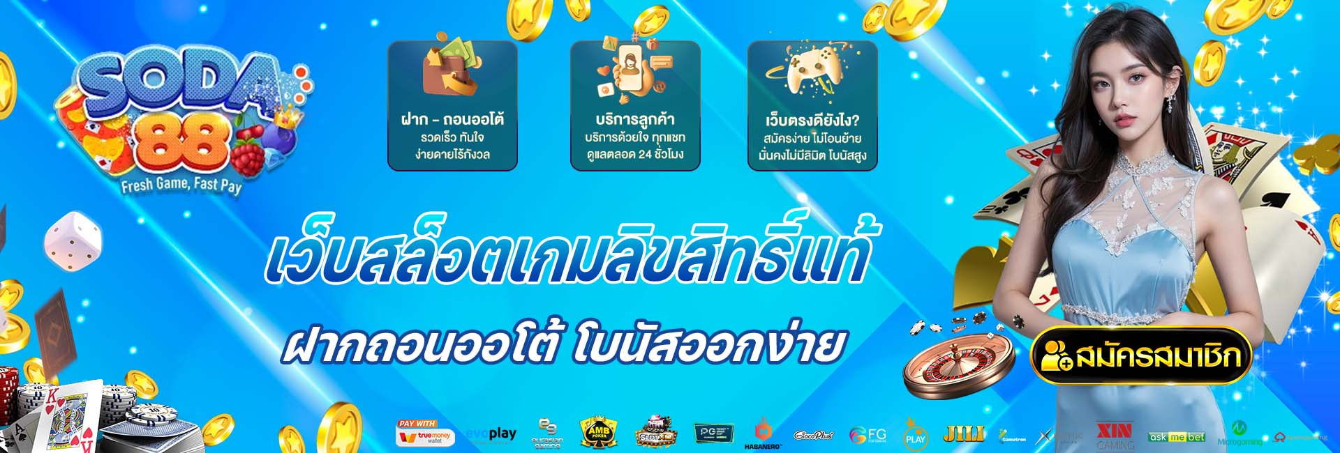 การสมัครสมาชิกง่าย ใช้เพียงเบอร์โทรศัพท์และบัญชีธนาคาร ระบบฝาก-ถอนรวดเร็วด้วยระบบอัตโนมัติ พร้อมโปรโมชั่นและกิจกรรมพิเศษตลอดทั้งปี
